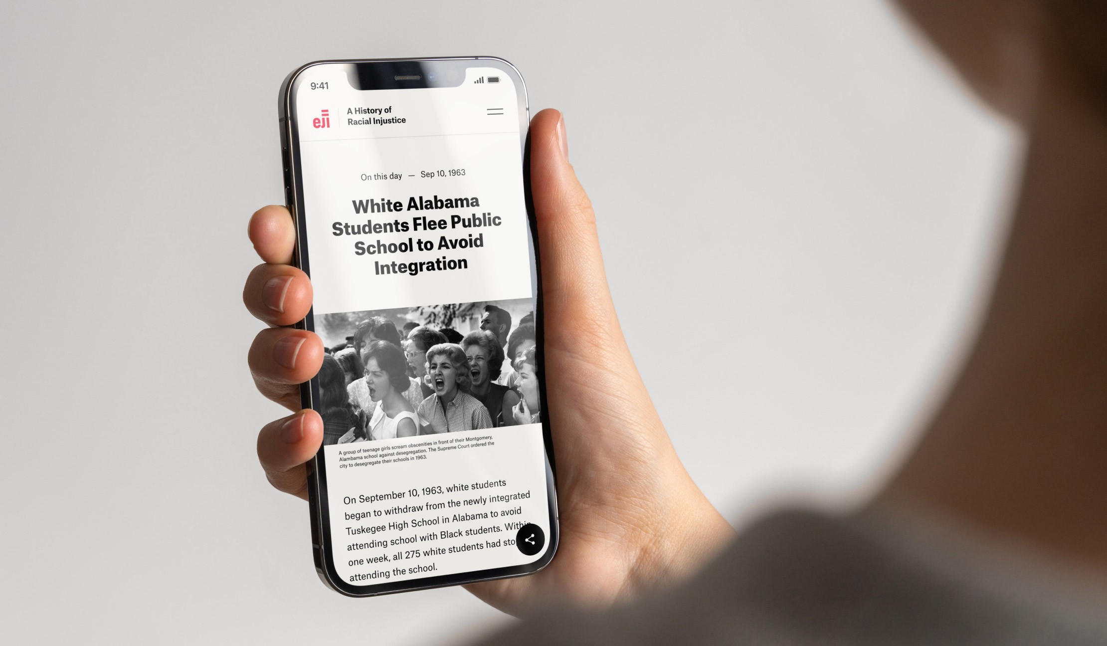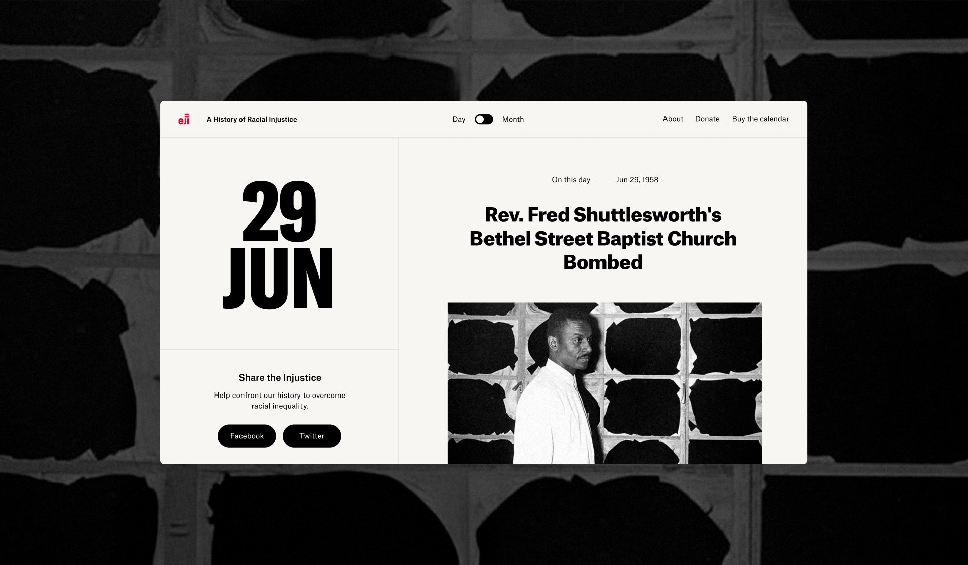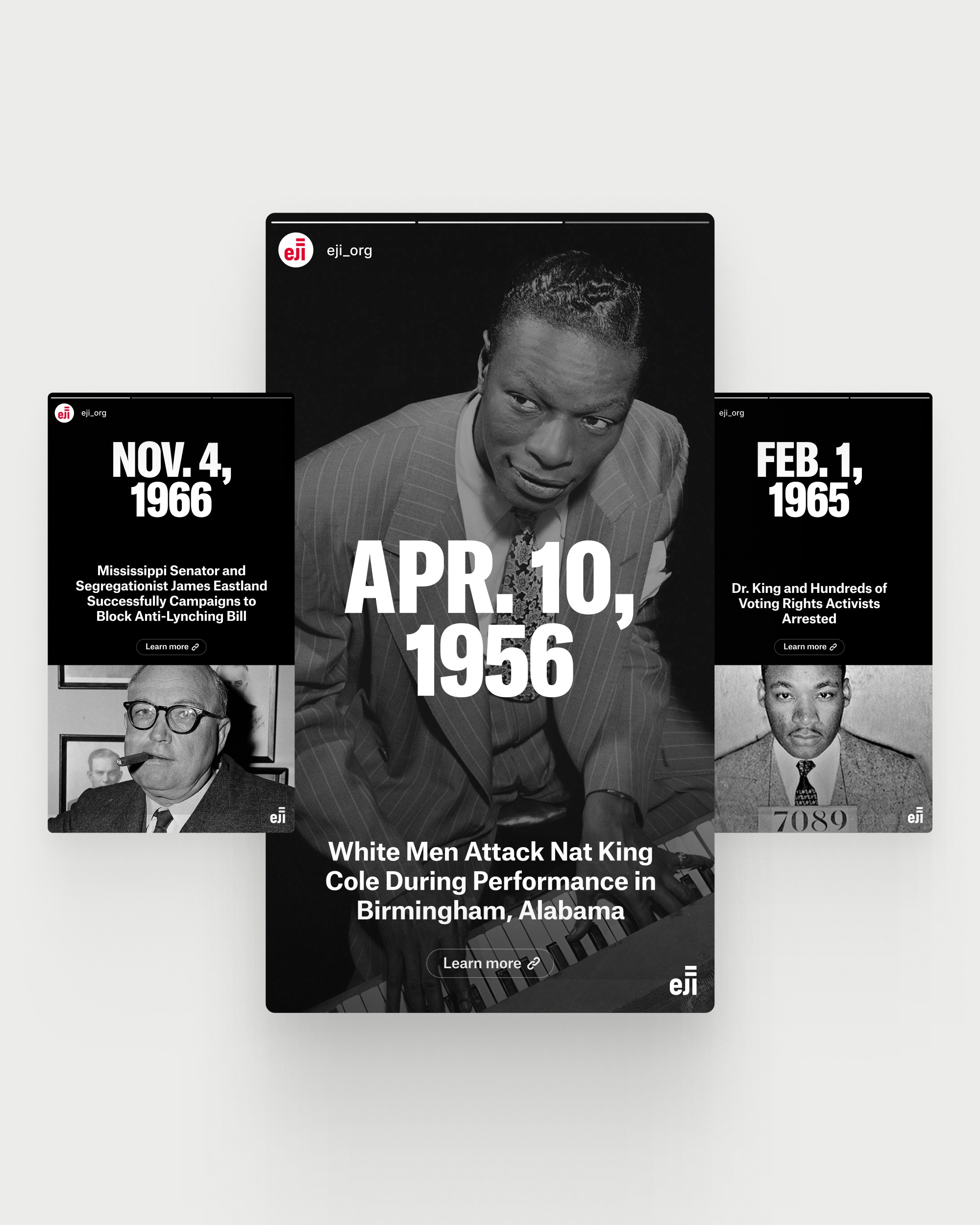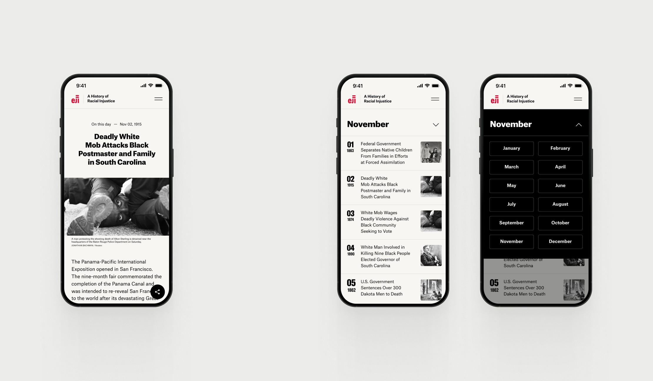 Designed as an interactive calendar, the website includes a toggle system that allows users to seamlessly switch between day and month views. Building on EJI’s existing visual identity, we introduced the font "GT America - Compressed Black" to give the dates a bold, impactful presence, emphasizing the significance of each moment in time. Stories are easy to explore and share across social platforms, encouraging engagement and helping extend the reach of EJI’s mission.