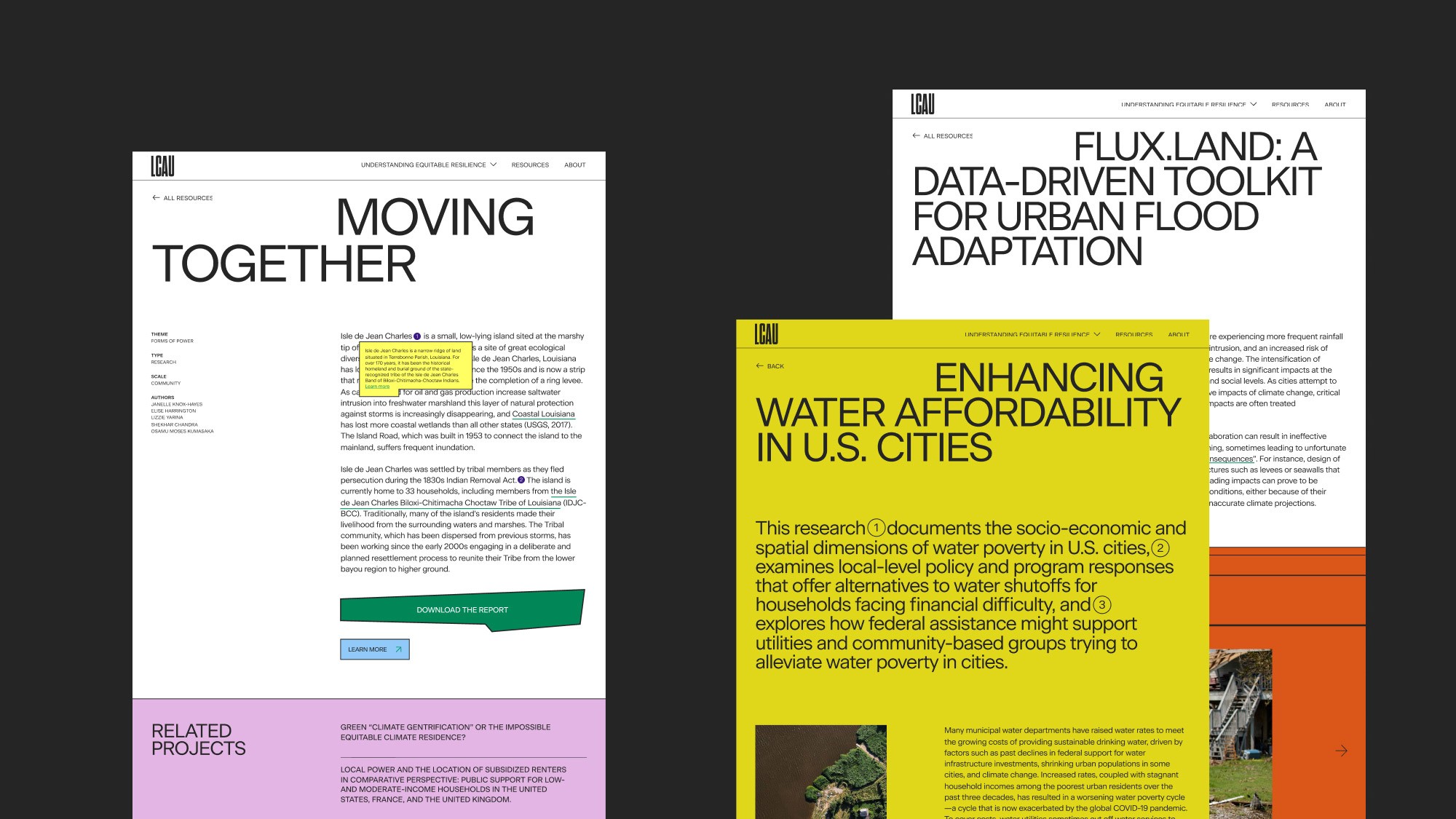 The Equitable Resilience Portal, developed for MIT’s Center for Advanced Urbanism, is a resource for researchers and community organizers addressing social inequities intensified by climate change. Its branding balances clarity and creativity: Beausite Classic, a geometric typeface, ensures legibility and accessibility, while a modern, colorful palette brings vibrancy and optimism. Modular shapes inspired by architectural plans and divider lines create depth, guiding users through a layered, immersive experience that feels both structured and exploratory.